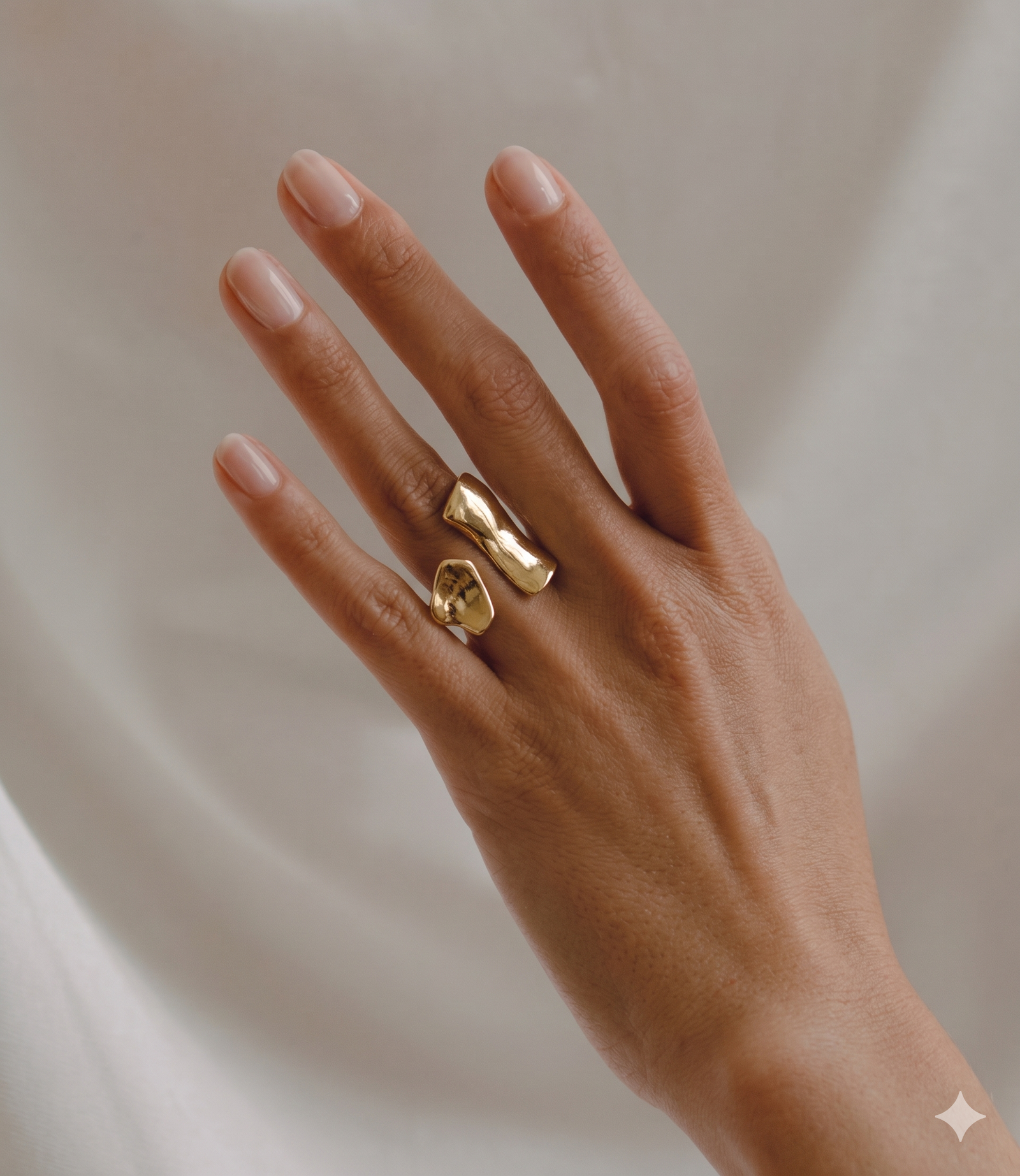 Anillo abierto de diseño moderno en tono dorado, ideal para complementar cualquier look. Talla ajustable.