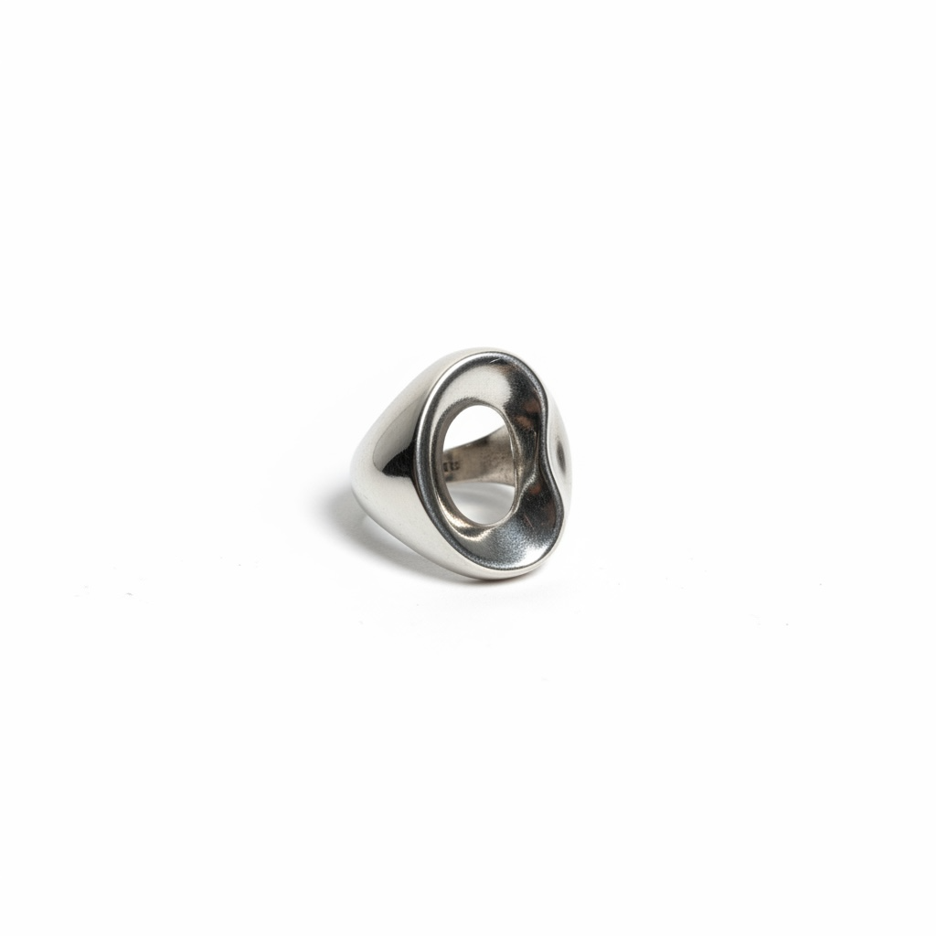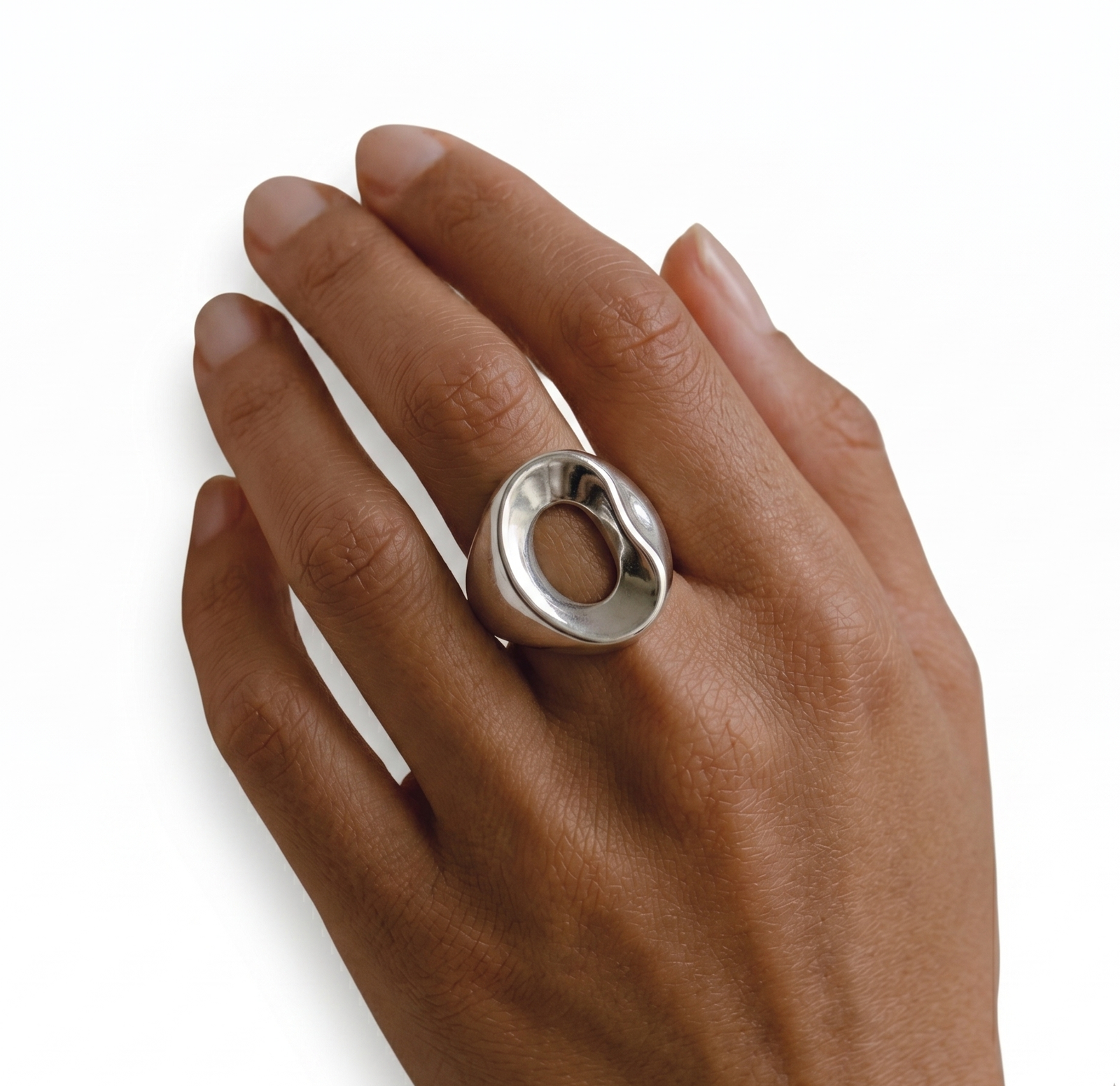 Anillo moderno y versátil en tono plateado, ideal para complementar cualquier look. Se encuentra en estado nuevo con etiqueta. Talla 19.