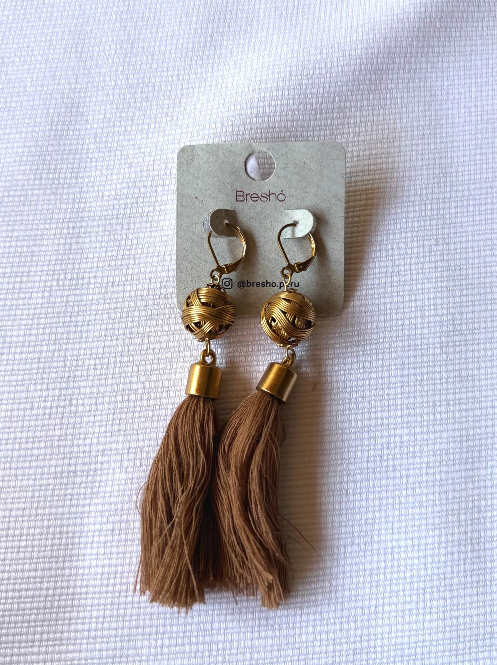 Añade un toque bohemio y sofisticado a tu look con estos aretes. Presentan borlas de hilo en color camel y una esfera tejida dorada, ideales para elevar cualquier outfit de día o noche.
