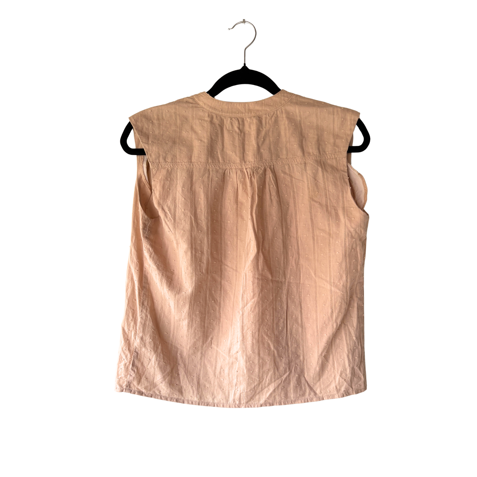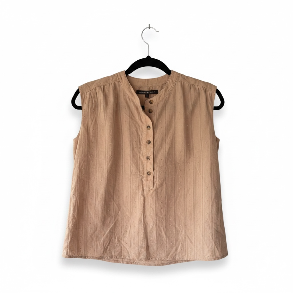 Esta blusa de Mentha & Chocolate destaca por su tejido con textura plumeti y su versátil color nude. Ideal para un look de oficina o una salida casual, su corte sin mangas y cuello mao aportan elegancia y frescura.