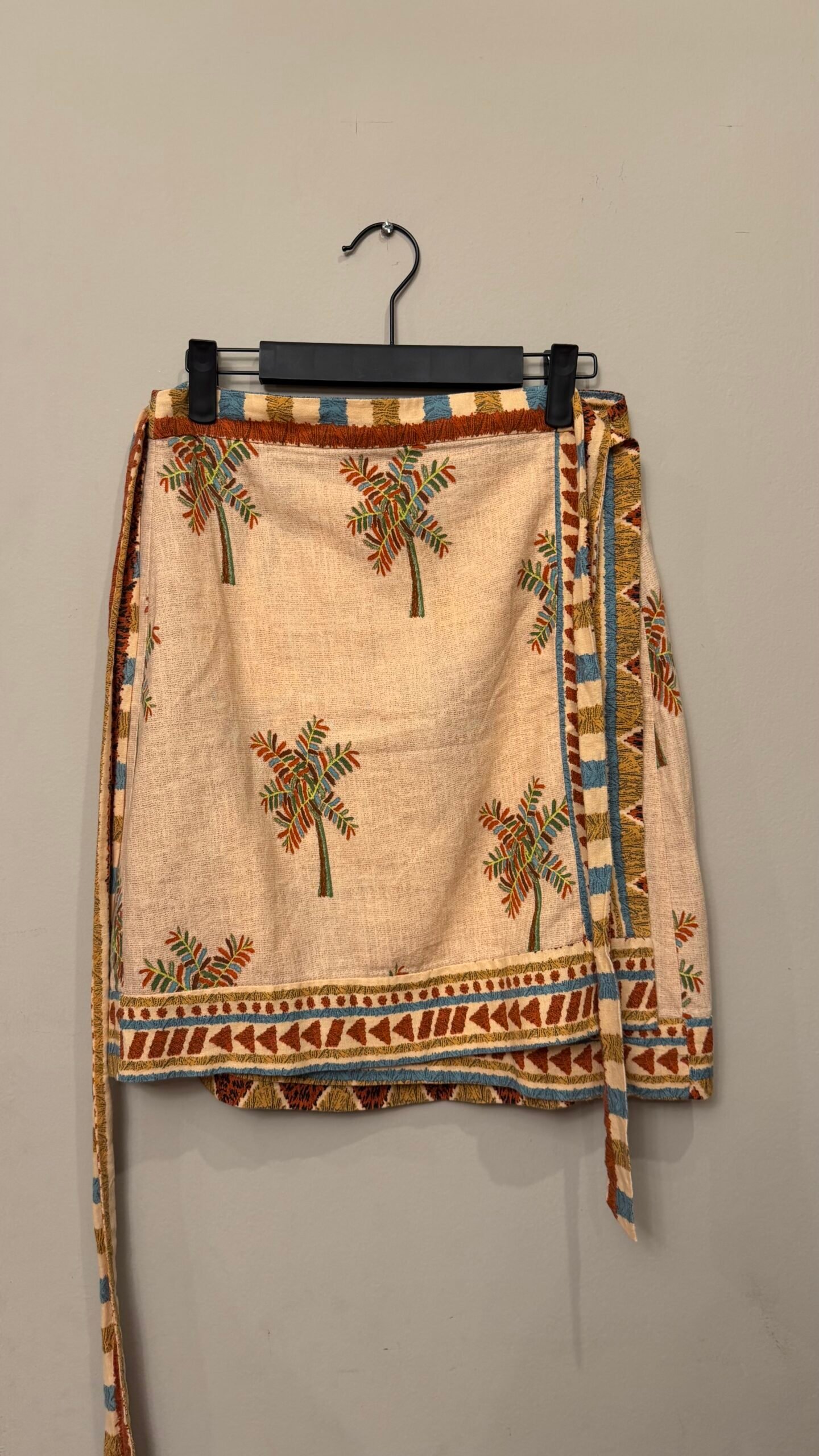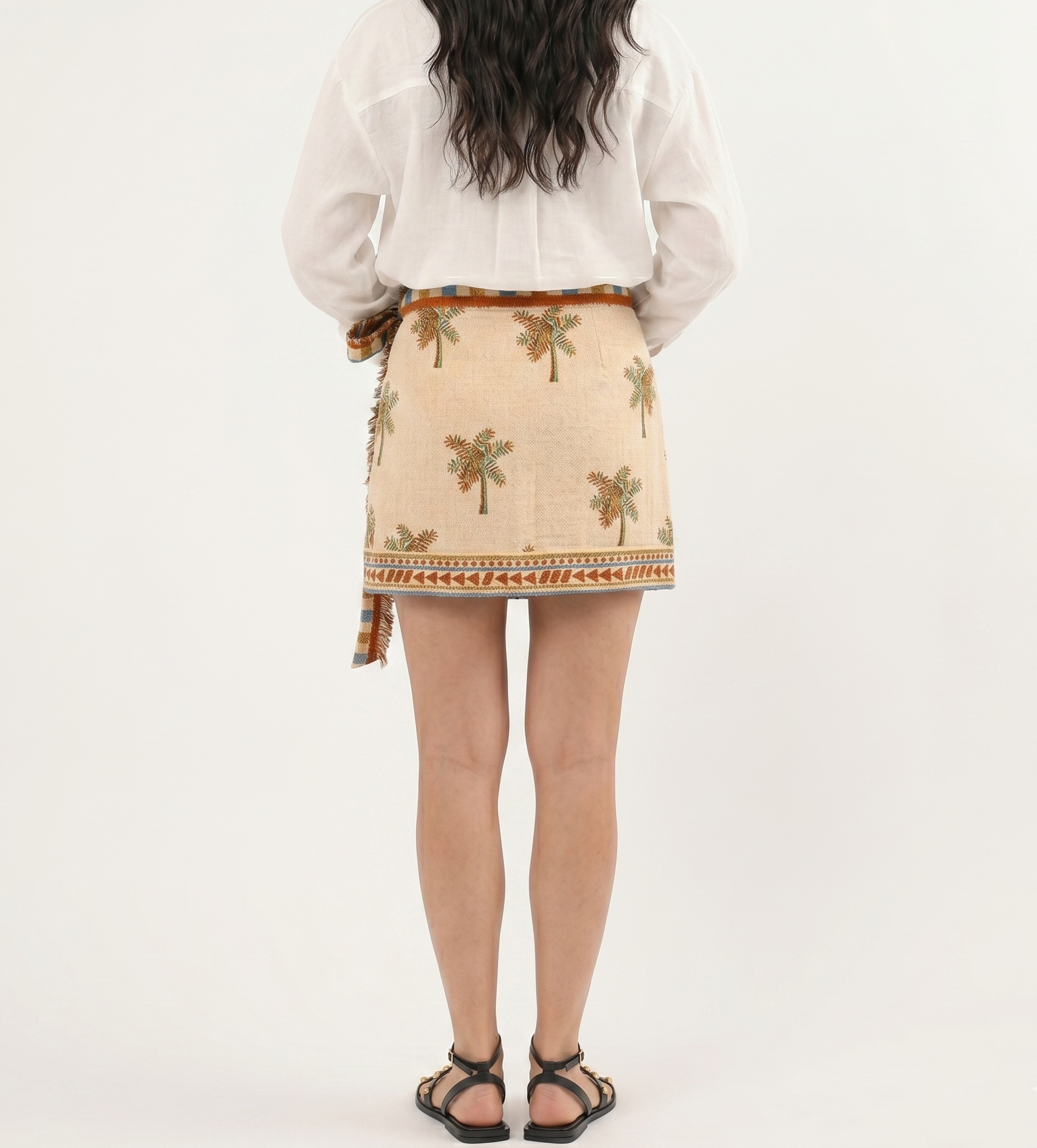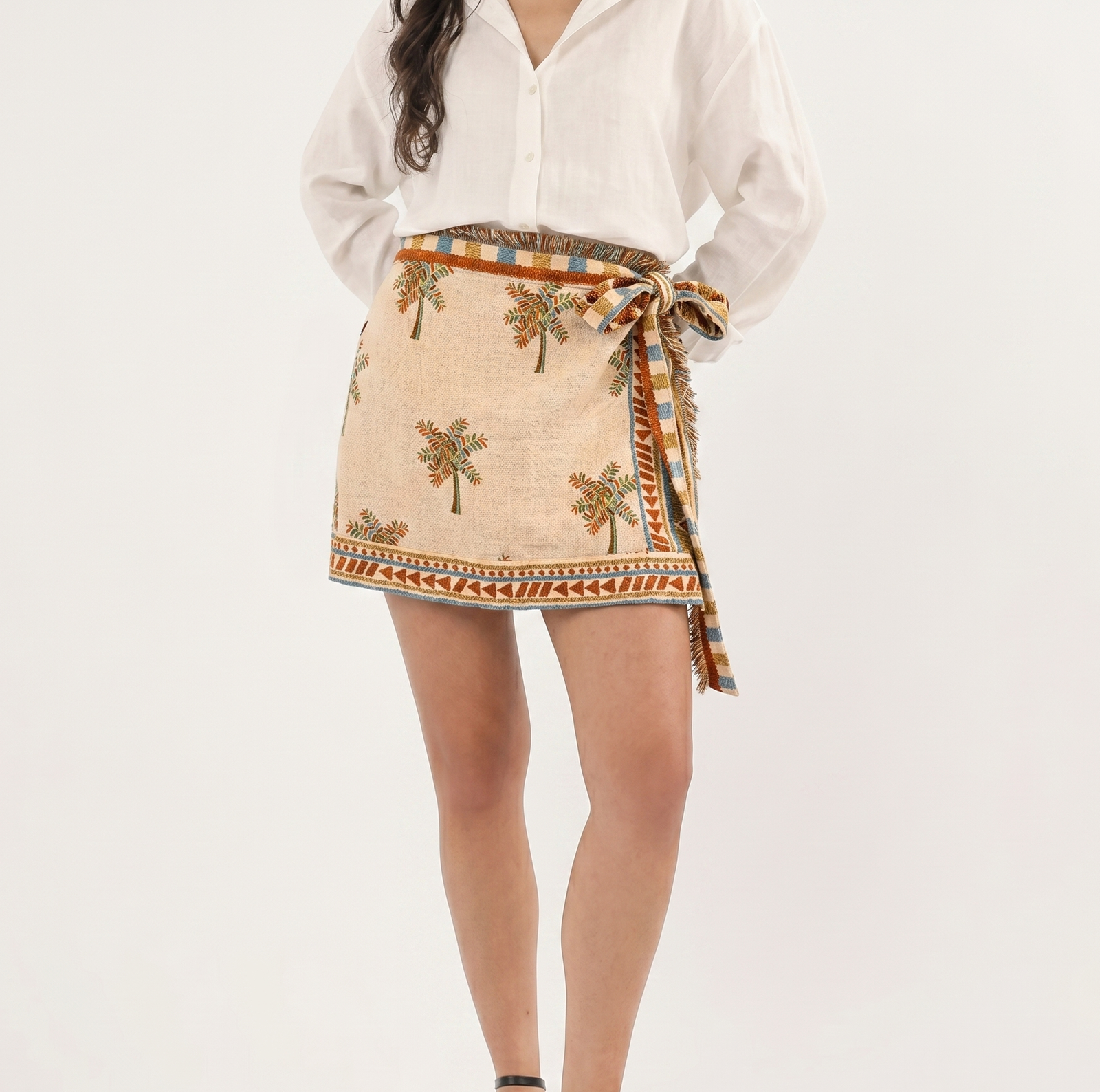 Elegante falda tipo pareo en mezcla de lino con diseño tropical brasileño.