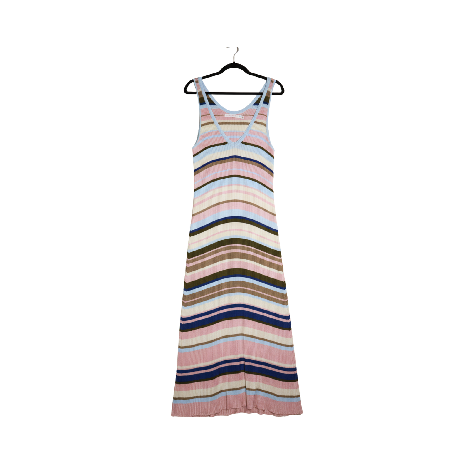 Vestido midi de punto acanalado con rayas multicolor, ideal para un look casual chic. Combínalo con zapatillas o sandalias.