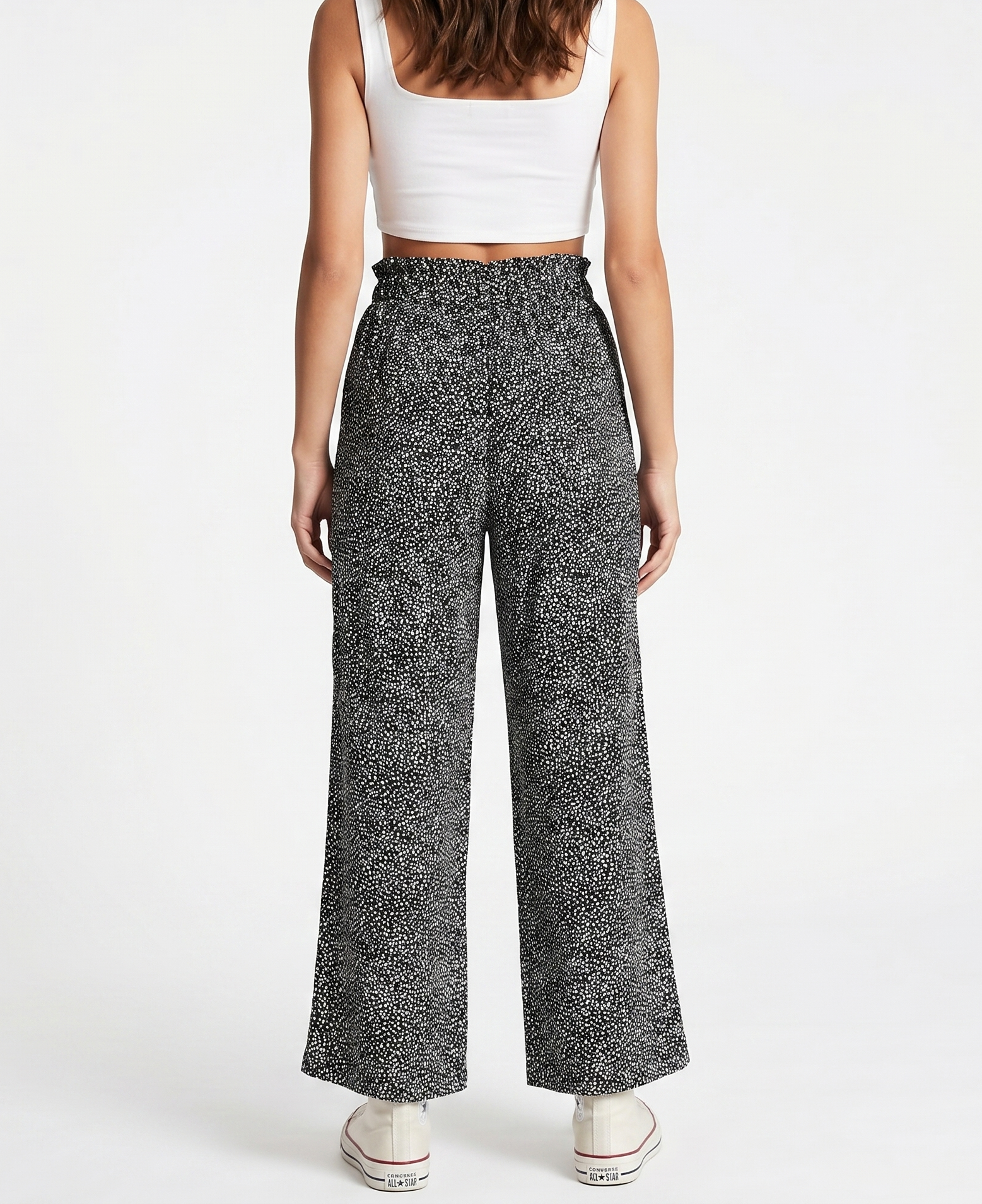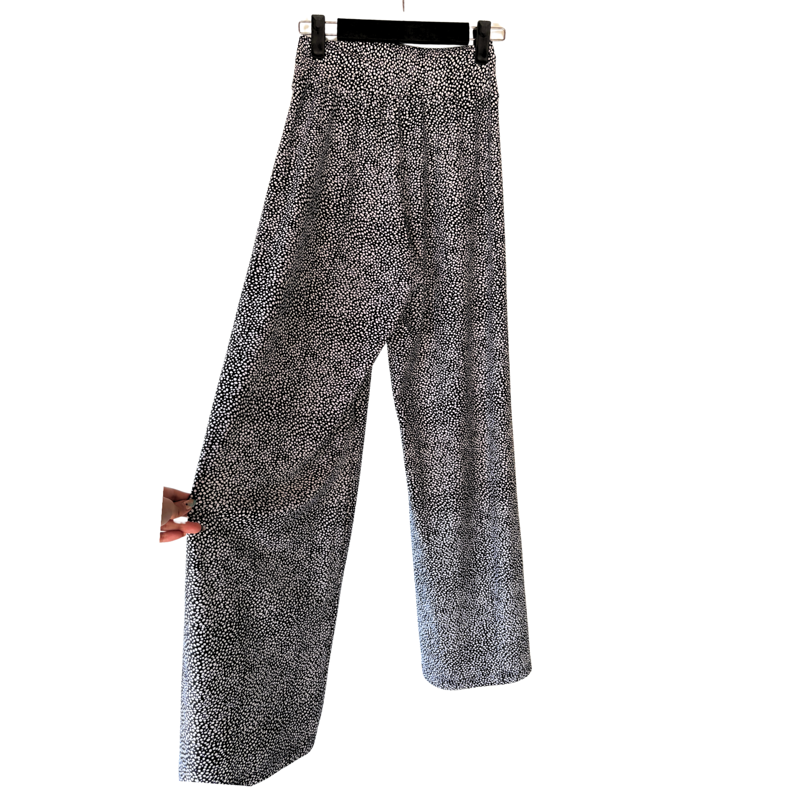Pantalón de la marca peruana Vero Galindo, con un diseño de puntos abstractos en blanco y negro. Confeccionado en una tela ligera que aporta movimiento y elegancia. Ideal para combinar con básicos y elevar tu look diario.