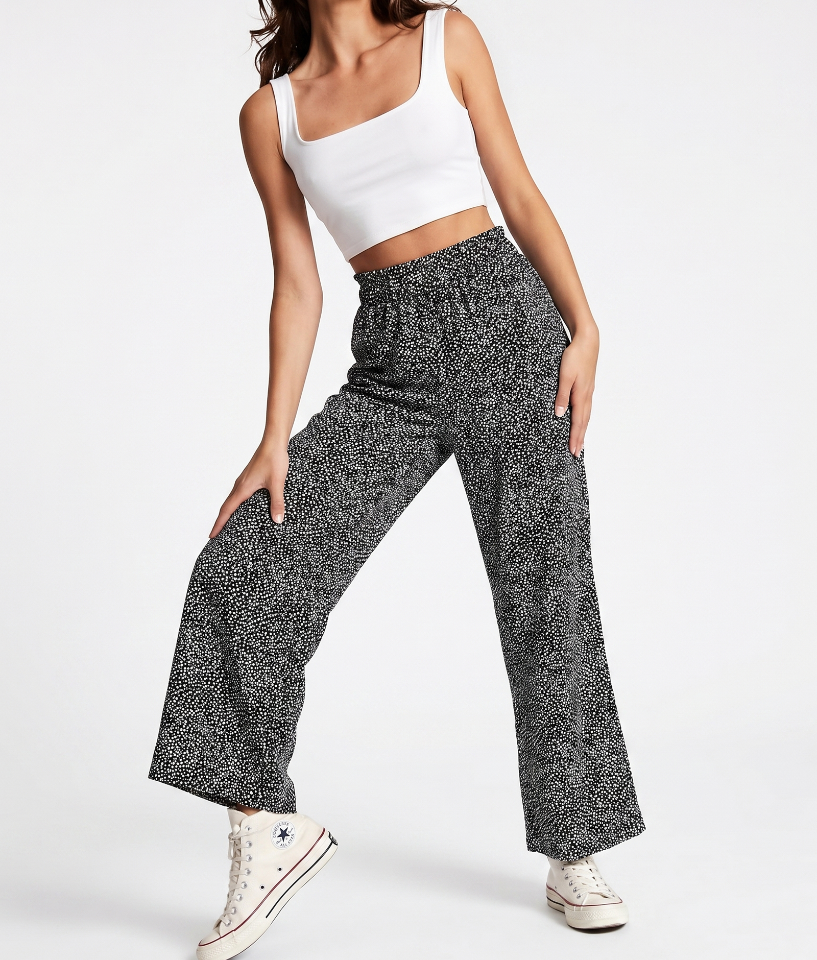 Pantalón fluido con estampado abstracto, versátil y cómodo.