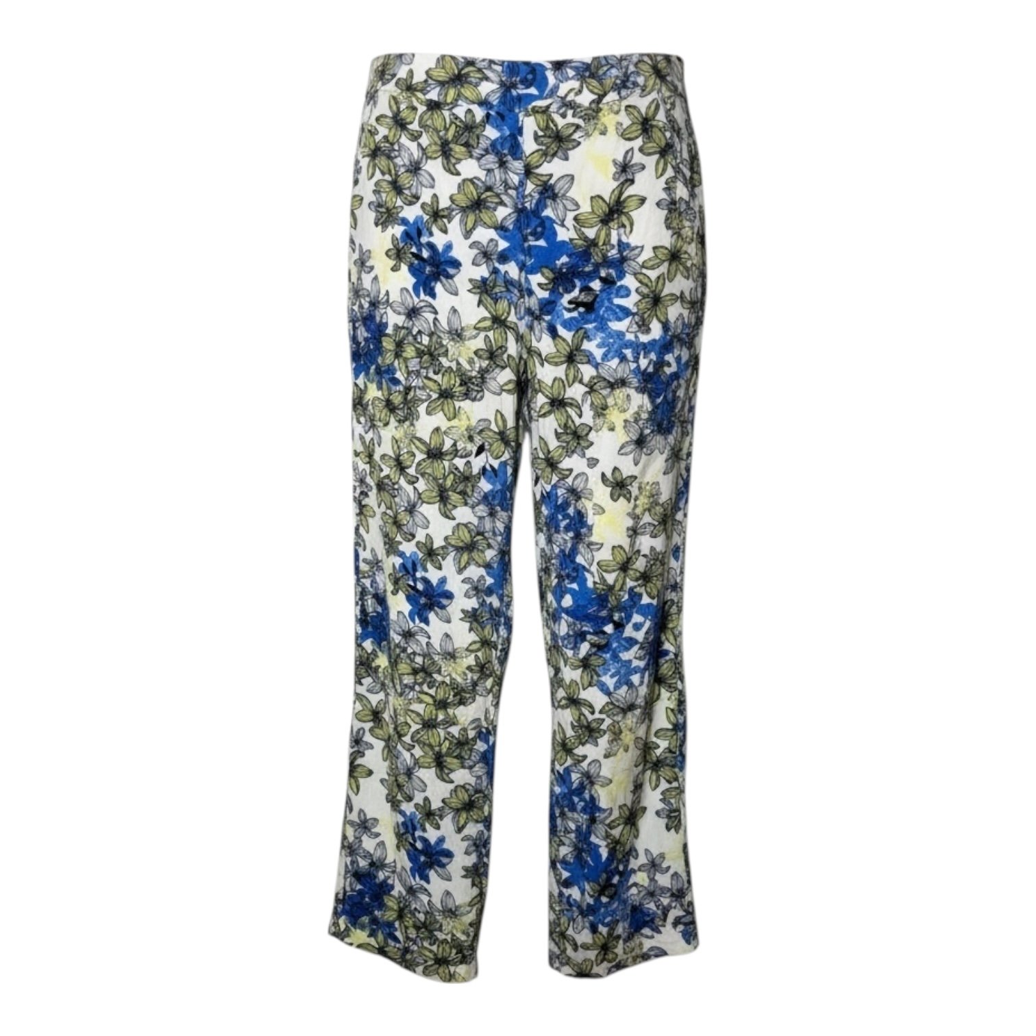 Pantalón Hering con un vibrante estampado floral en tonos azules y amarillos sobre blanco. Ideal para un look casual y fresco, perfecto para la temporada de primavera/verano. En muy buen estado.
