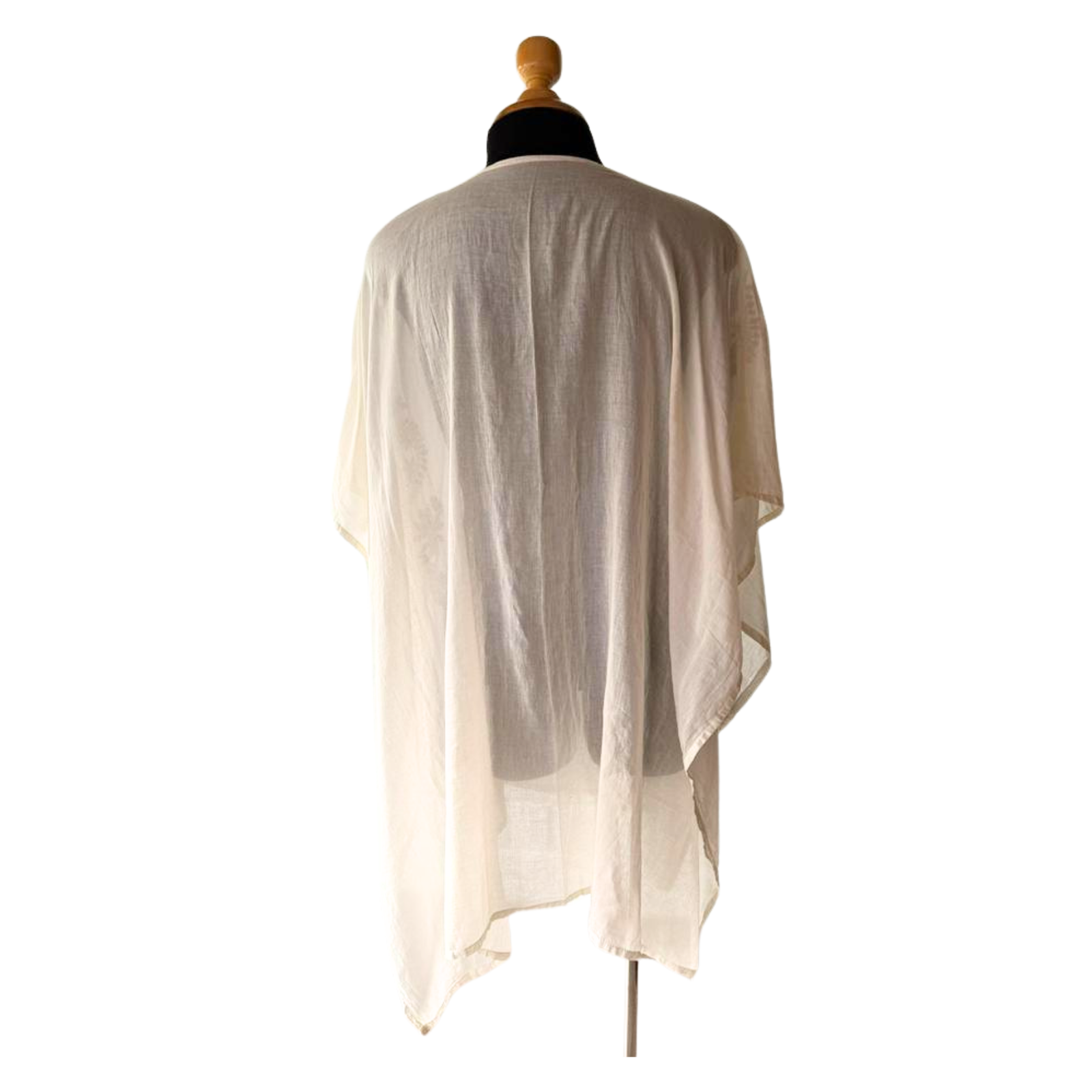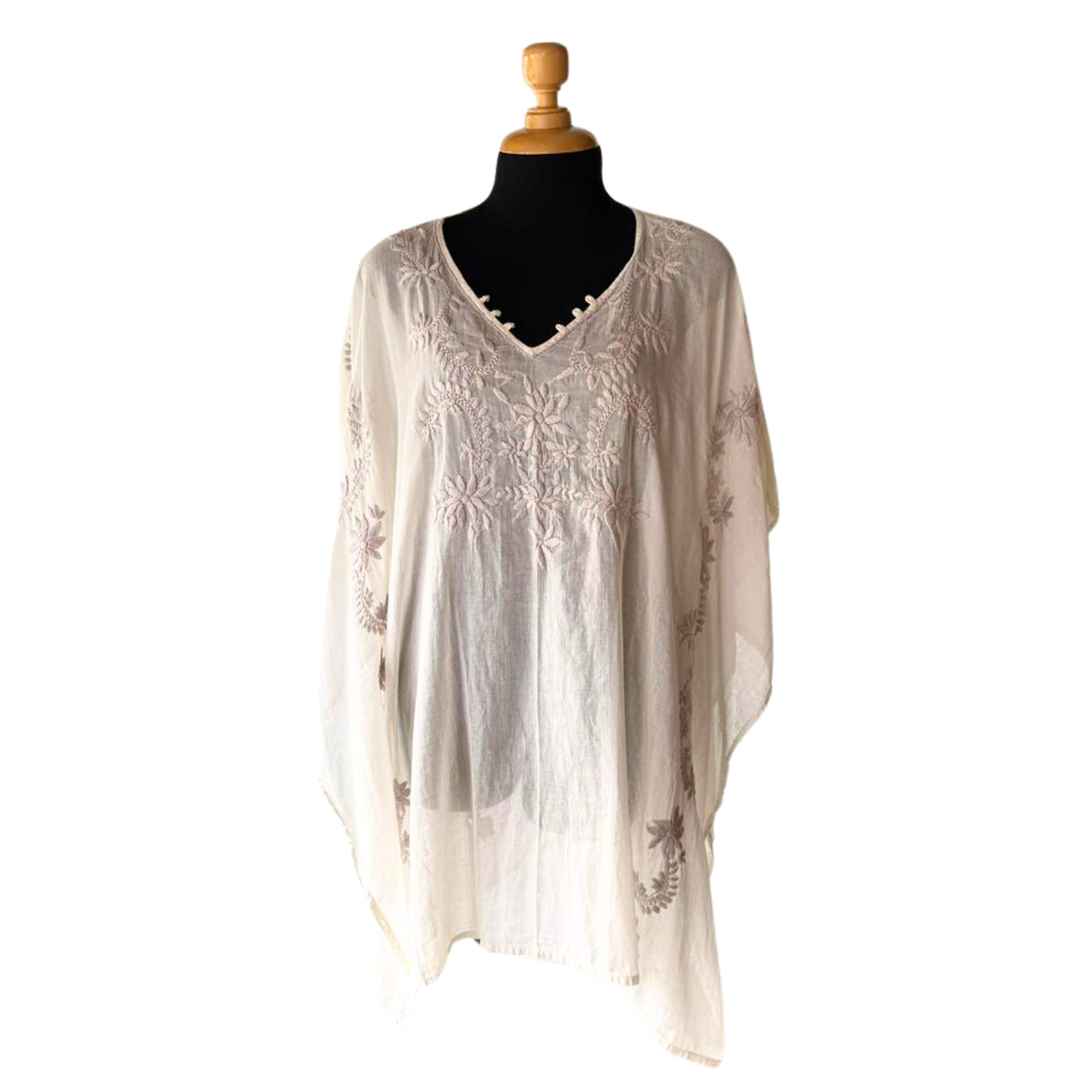 Eleva tu estilo veraniego con esta salida de playa tipo kaftán en tono off-white. Destaca por sus delicados bordados florales tonales y detalles de presillas en el escote en V, ofreciendo una silueta fluida y fresca ideal para la playa o piscina.