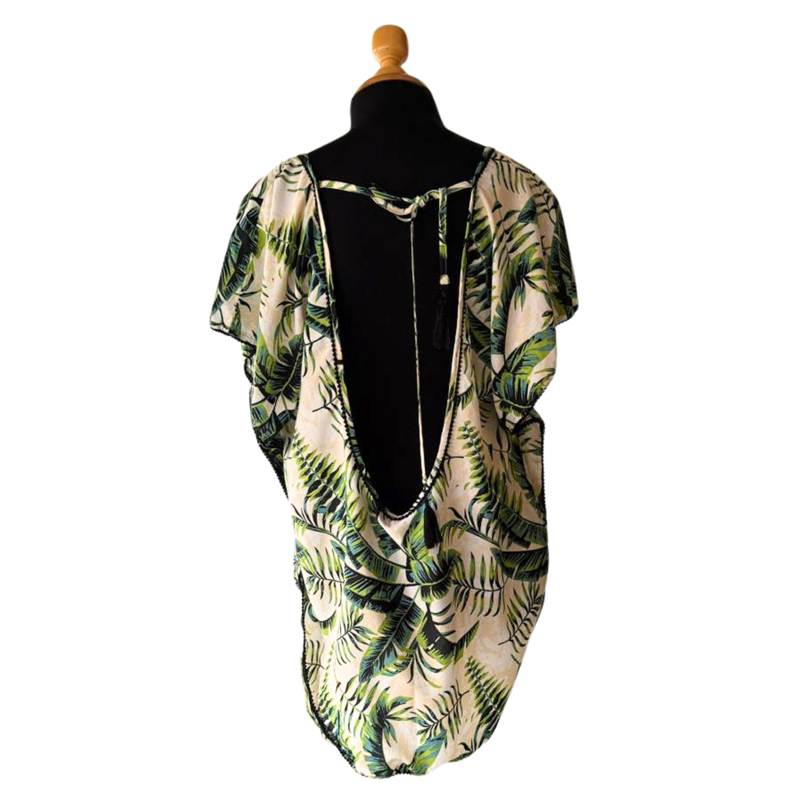 Esta salida de playa es el complemento ideal para tus días de sol. Con un diseño holgado y un estampado tropical en tonos verdes, ofrece comodidad y estilo sin esfuerzo sobre tu traje de baño favorito.