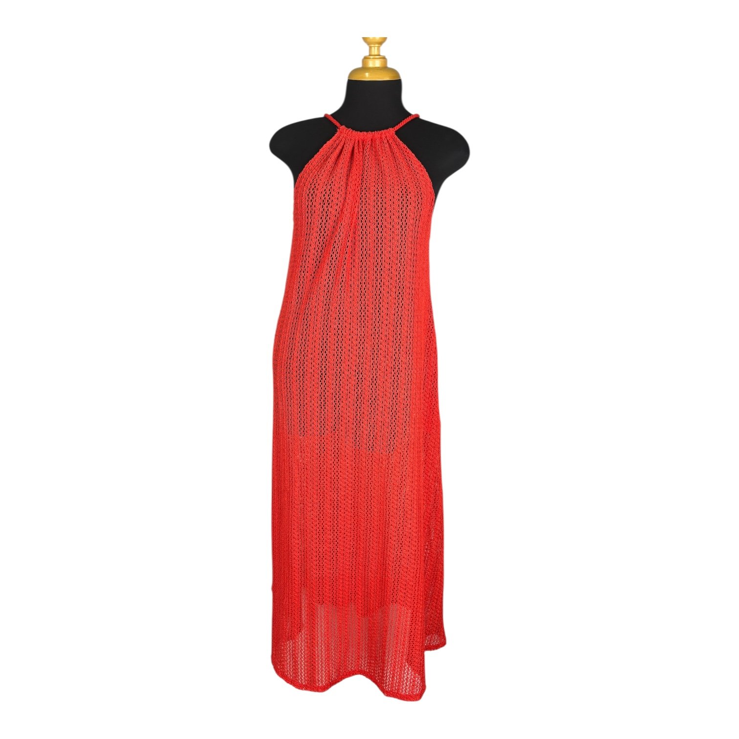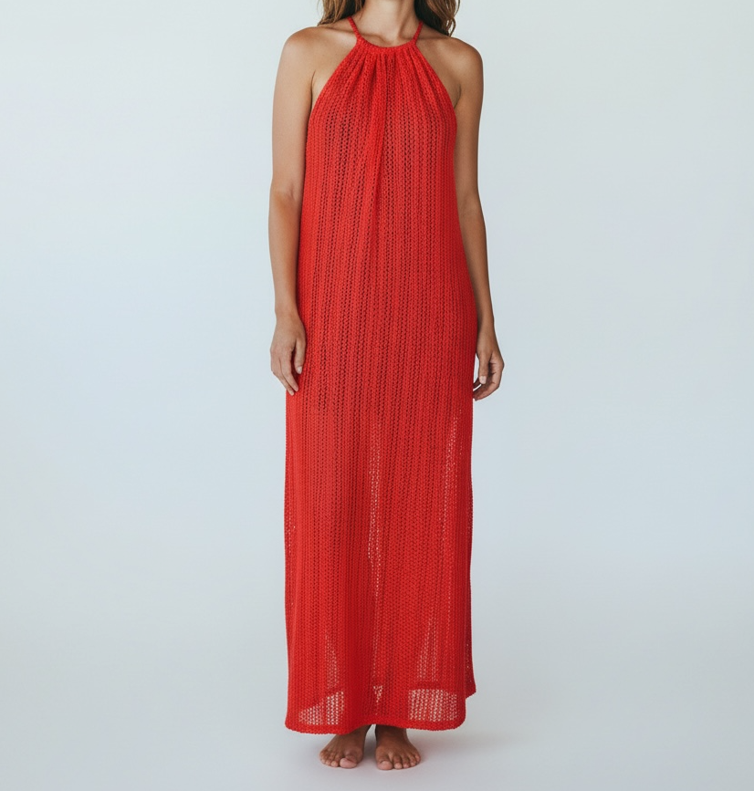 Vestido largo tejido en color rojo intenso con cuello halter y diseño calado. Ligero y fresco, ideal para climas cálidos, vacaciones o como salida de playa. Su silueta fluida y textura lo convierten en una prenda llamativa dentro de una propuesta consciente y única.