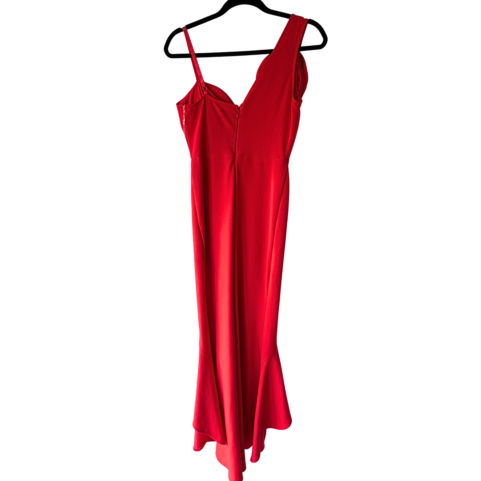 Elegante vestido rojo asimétrico con detalle de flor y volantes.