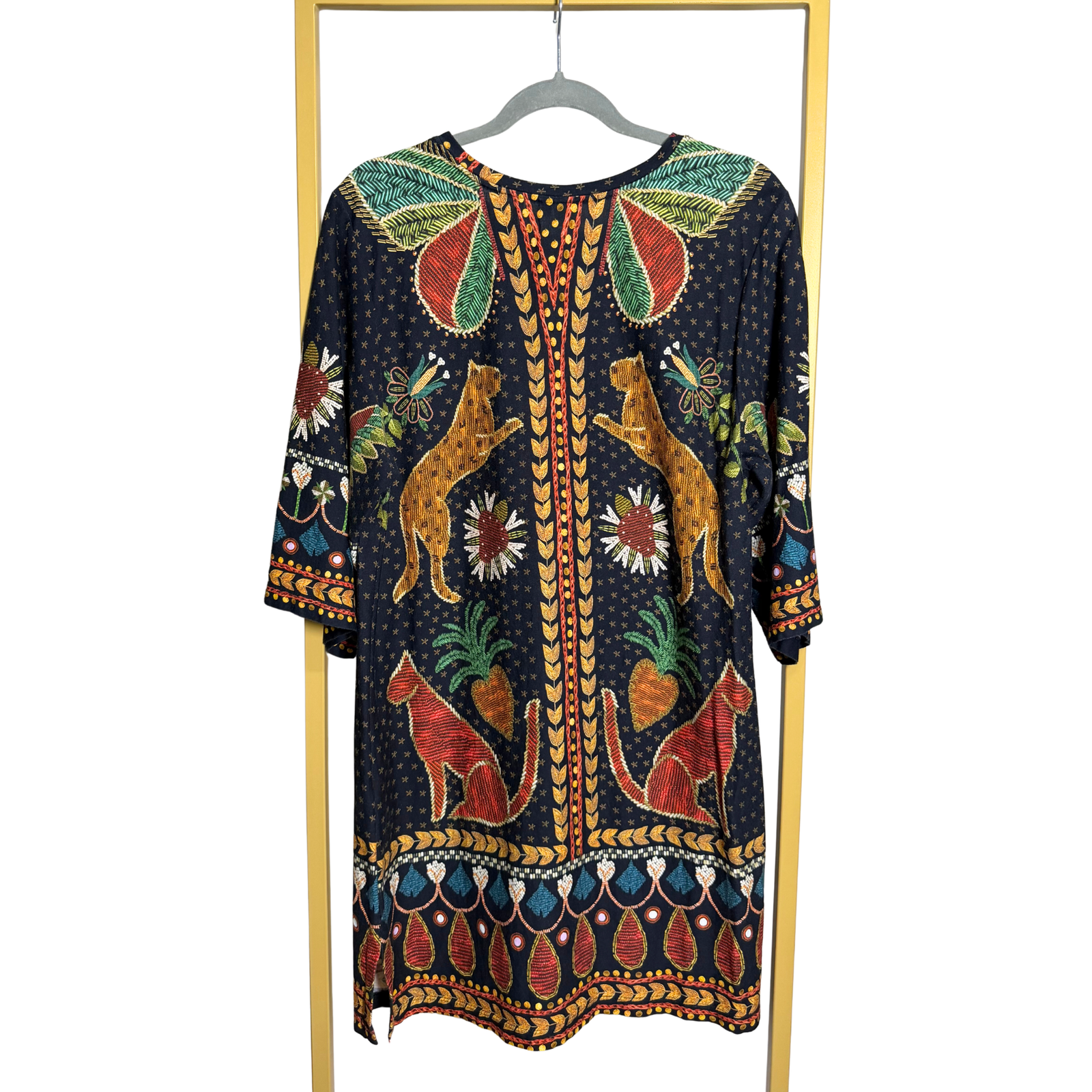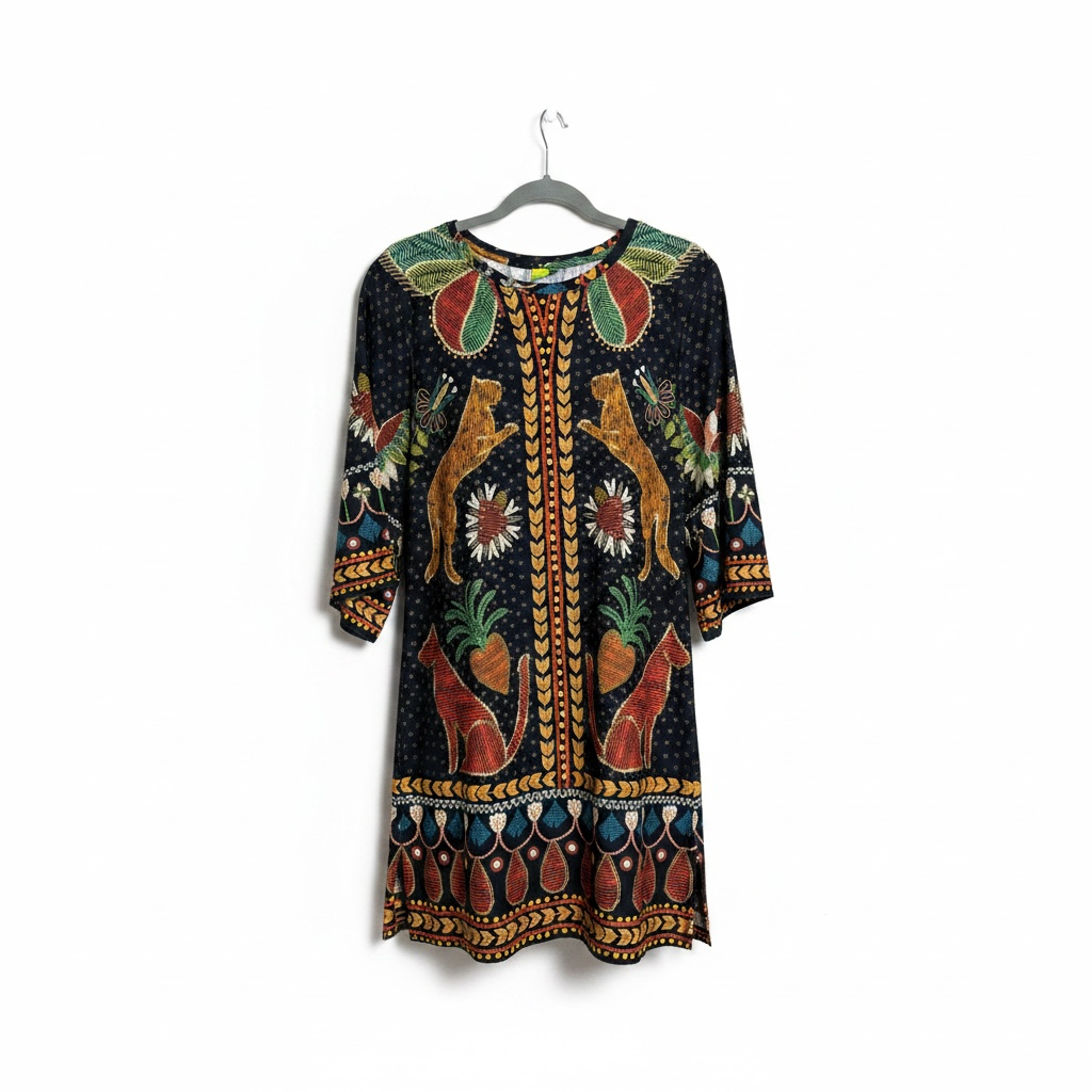 Este vestido de la reconocida marca brasileña Farm Rio destaca por su vibrante estampado de jaguares y elementos tropicales sobre un fondo negro. Confeccionado en 100% algodón, ofrece frescura y un estilo bohemio único, ideal para un look casual con mucha personalidad y color.