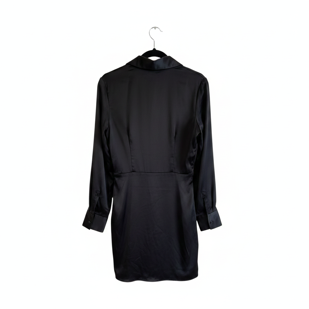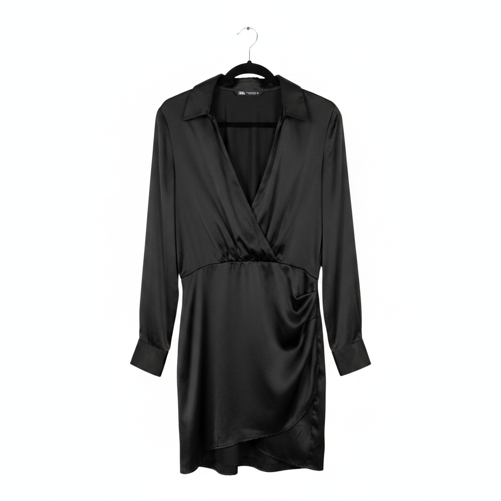 Este vestido Zara destaca por su acabado satinado y sofisticado escote cruzado. Cuenta con cuello camisero y mangas largas, ideal para un look de noche o cóctel. Su corte favorecedor realza la silueta con elegancia y versatilidad.